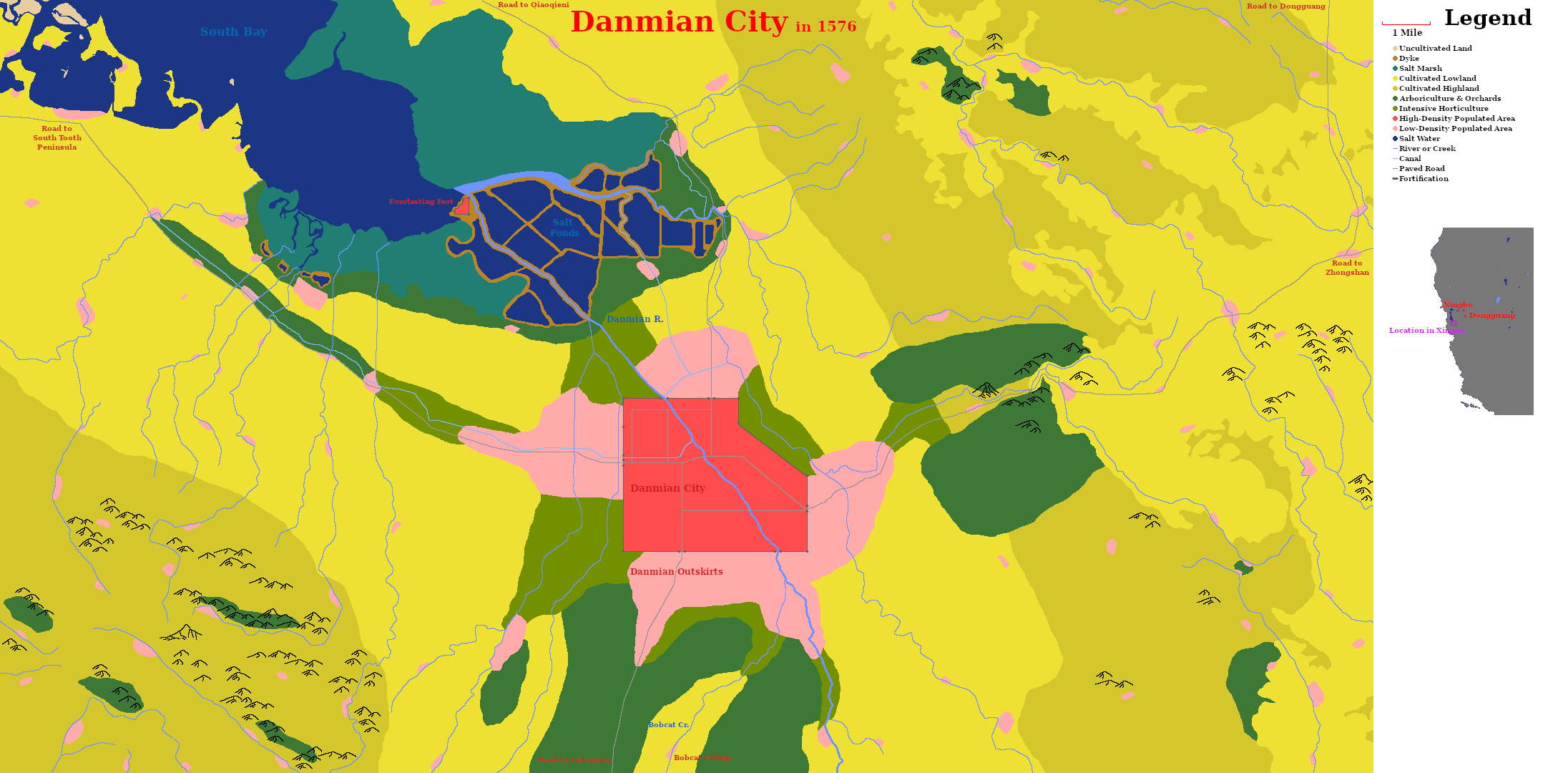 Danmian straddled both sides of the Danmian river, which flowed through the vibrant of Joyful Heart Valley, at the southern tip of the Bay. In 1576, Joyful Heart Valley was a densely-populated agricultural zone where magnates dominated land ownership with sprawling citrus fruit plantations, which were mainly oranges, of both Mandarin and sweet orange varieties. These were dried and either sold to the Treasure Fleet and other ships to ward off scurvy or exported all over Xinguo and even as far away as Mexico City and Lima, Peru. Oranges from the Danmian area were exported so far abroad that much later, in 1724, while the French explorer Etienne Veniard de Bourgmont was visiting the Padoucas in what would later become Kansas, he was served dried orange slices from a packing crate with Chinese writing on it—quite possibly having been imported from Joyful Heart Valley.