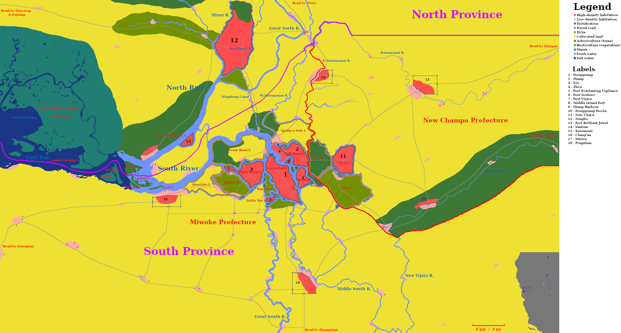 Excited at the sight of the prefect, the magistrates reiterated their demands to be let in. Aghast at the sight of his island (the border between Miwoke Prefecture and New Champa Prefecture is set on the branch of the river separating Shang from Cham Island) filled with unwanted Chinese townspeople, Pâl Karutdrak was in no mood to be taking demands. In fact, he was incensed at the very idea of these city magistrates from a neighbouring prefecture daring to order him around. With a flourish of his arm, he told them to go away.