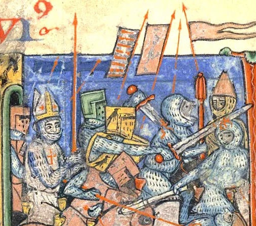 Otto is now trapped against the river. Crossing back now would be foolish, lest Trajan attack while Otto’s men are only halfway across. Although he is sorely outnumbered—12,000 to Trajan’s 27,000—the bishop decides he must make his stand. In the morning, he draws up his men inside a bend of the river, where Trajan will have difficulty bringing his superior numbers to bear. Dismounting, Otto’s knights fight on foot wrapped in mail from head to toe, and with kite shield and sword in hand. Bishop Otto himself dons a Righteous coat of plates and belt of Truth, puts on the helmet of Salvation, and picks up the shield of Faith and mace of the Spirit. Surrounded by his knights and zealous warrior-priests, the bishop performs mass on the field before the battle begins. A group of monks in armour with unsheathed swords parade a crucifix in front of the army while repeating the words of the liturgy spoken by Otto so that all can hear.