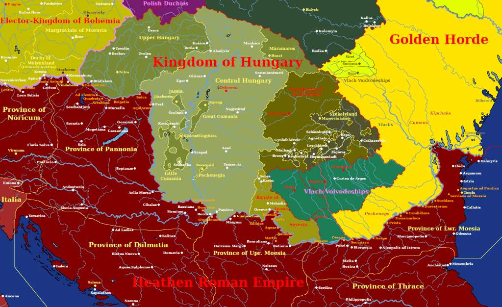 When Batu Khan crosses the Danube, he does so just north of the Hungarian town of Pest. Pest’s sister-city of Buda, directly across the river, was replaced in the Act of God by the Roman city of Aquincum, which is a major fortified location. Agricola is 130 miles away in Vindobona (the city the Medieval Europeans know as Vienna), the capital city and also the only place Agricola considers to be worth putting significant military resources into at this time. The Hungarian border with Pannonia has been quiet since the Act of God, but Vindobona sits across the river from the Duchy of Weisenland (formerly northern Austria) which is now part of the Kingdom of Bohemia, which makes Vindobona a key part of the frontier facing the Holy Roman Empire. Consequently, the majority of all legionaries and auxiliaries in Pannonia are concentrated in and around Vondobona under Agricola’s personal command. Specifically, there are 10,000 men there, leaving only 4,000 to guard the border facing Hungary.
