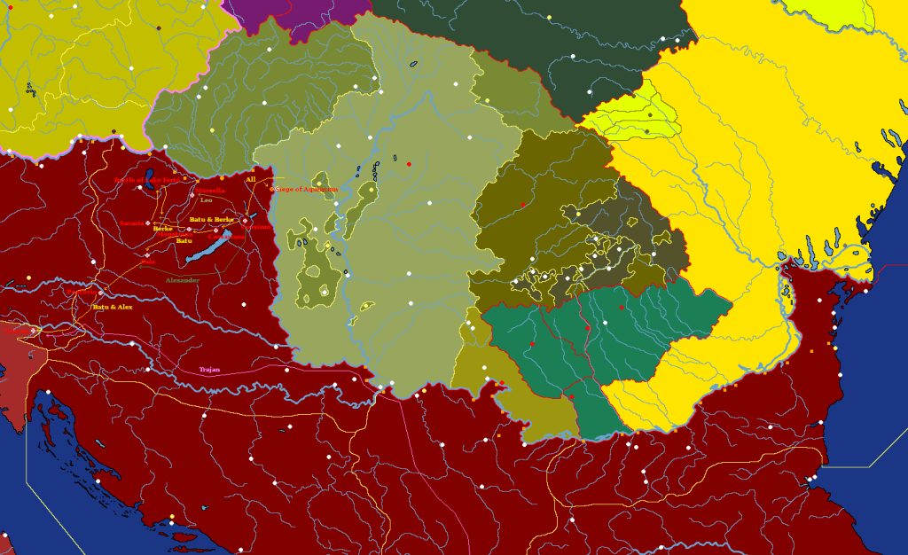 Perhaps the most significant outcome of the battle is that it causes Batu to reconsider his movements. He decides to send Leo and the Hungarians north to reinforce Berke, and orders Berke to capture Vindobona. Batu, meanwhile, links back up with Alexander Yaroslavich and the Rus’, and they head west with the intention of finding a pass over the Dinaric Alps and down into Italy. Along the way, they pillage several cities and countless rural settlements until they arrive in the far reaches of the upper Savus River in early November, 101 AD.