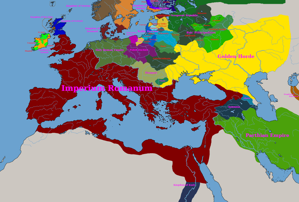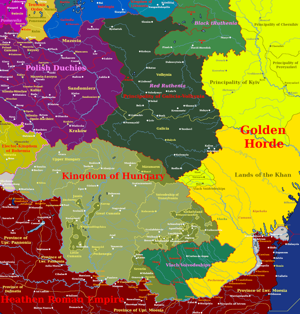 CHONKY MAP (Click here for a higher resolution)smoll mapThe Rhine frontier in 1250/98 ADHungary, Galicia-Volhynia, and environs in 1250/98 AD.The Golden Horde and the lower Danube frontier, 1250/98 AD.The Kingdom of Hungary (featuring the feuding thrones in Debrecen and Transylvania) in 101 AD, on the eve of the 2nd Mongol invasion of Hungary.Moesia and Thrace in 101 AD, on the eve of Sartaq’s infamous raid.The Kingdom of Hungary and the Danube frontier in the immediate aftermath of the 2nd Mongol Invasion of Hungary.